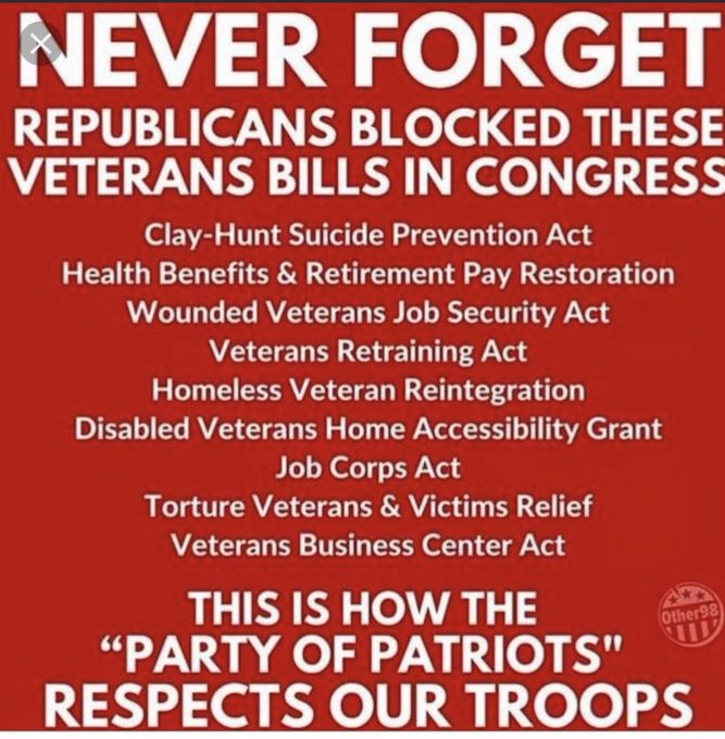If you go back through all the bills and legislation that has EVER come through both Washington, DC or through the state houses of this country, you will be extremely hard pressed to find ANYTHING where the Republican Party members have voted IN FAVOR of anything that has to do with taking care of our military troops and their families or our veterans and their families or survivors. This has gone on for DECADES.