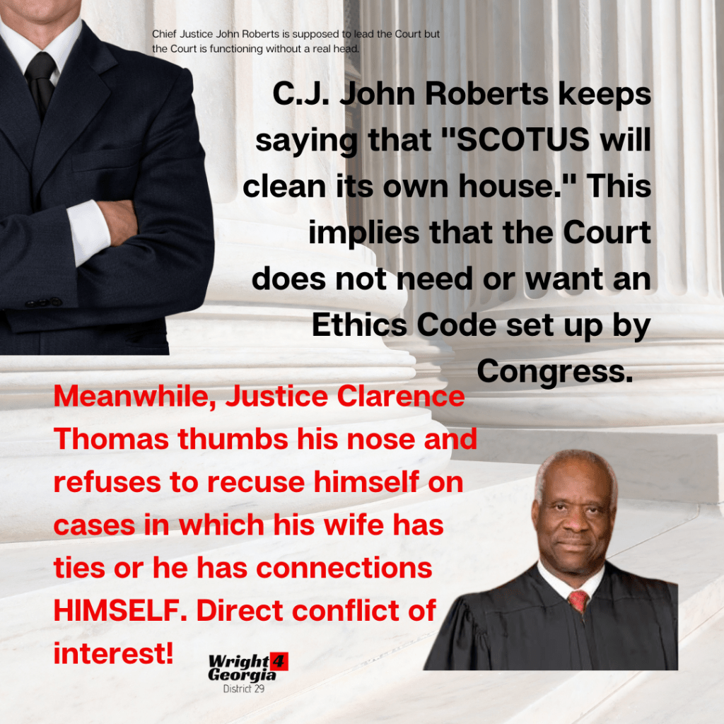 Justices are, in theory, supposed to ‘know the law’ and to render judgements on the cases that come before based solely upon the law as they understand it (both as written and as the people who wrote the law intended for it to be used aka the “spirit of the law”.) It is when they start bringing their own personal biases, whatever that might be, to the bench that we have problems. In this case, we have not one, but FIVE of the justices that are doing just in violation of their oaths. One of them, Clarence Thomas, is openly defying legal ethics by refusing to recuse himself from cases that involve himself and/or his wife, Virginia “Ginnie” Thomas. This is unacceptable on every level of legal and moral ethics.